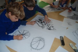 Working with the children’s drawings I create the designs for the ceramic pathway panels. I work at a scale of 1:4; then 1:1- drawing the designs in chalk on the studio floor. From the 1:1 chalk drawings I create the tracing paper templates from which the children will create the playground tiles. The tiles will be created in the next workshop…