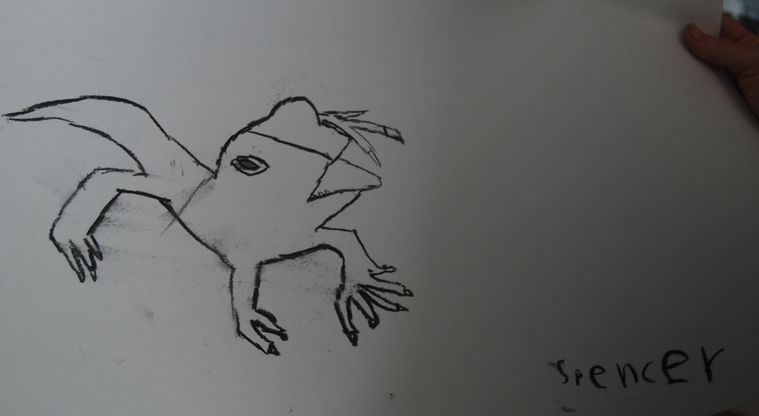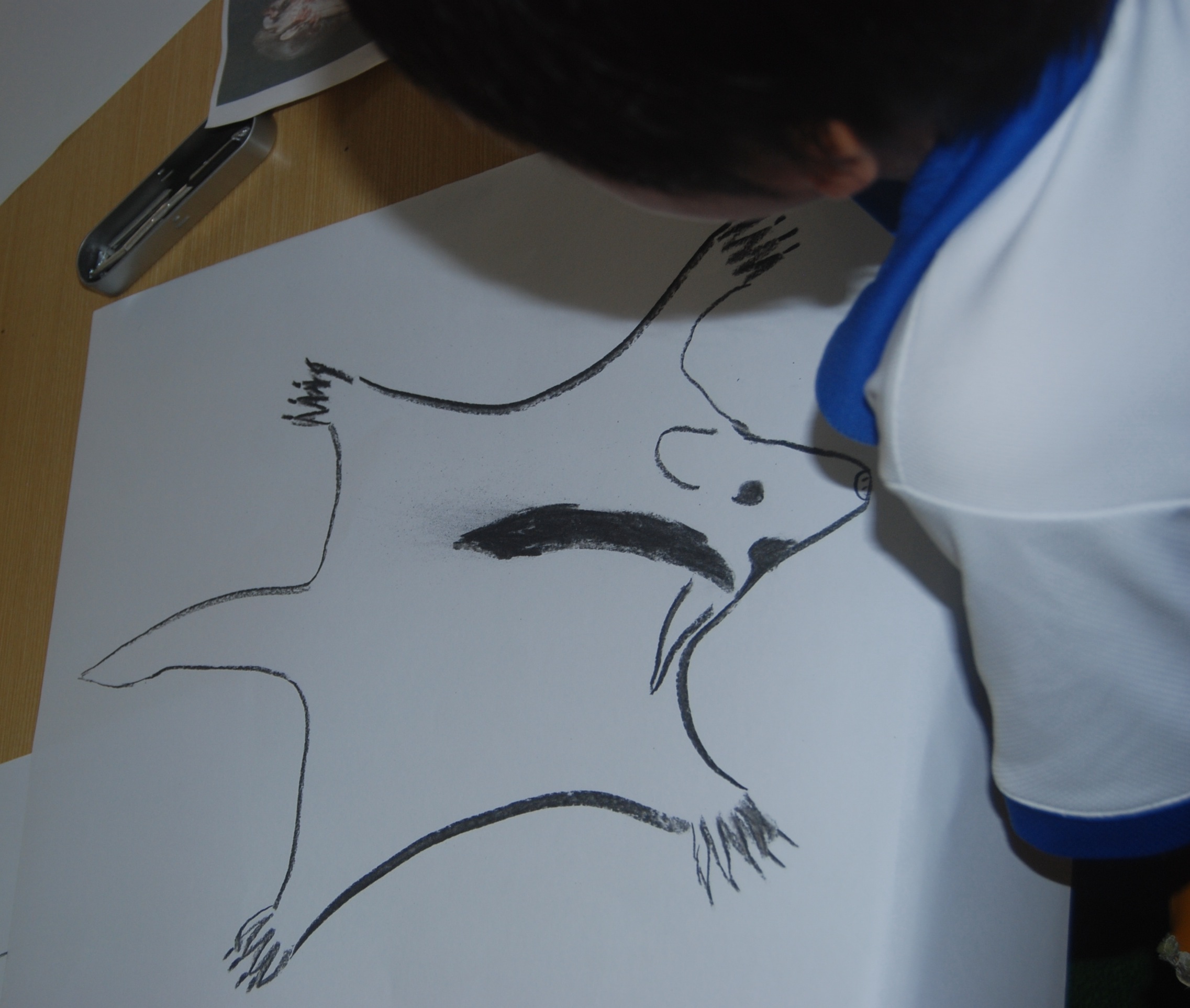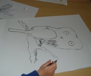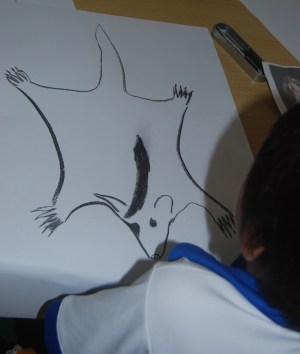 I like children to have the experience of working with charcoal. Like clay, charcoal is a tactile medium, so much more alive than pencil and texta. Drawing with charcoal pushes children out of their comfort zone. The children learn how to hold a stick of charcoal- so different from drawing with a pencil. They see how a varied pressure accentuates line; how a “fat” line comes forward and a “thin” line recedes; how smudging can be used to delineate a three dimensional form. I give the children large pieces of cartridge paper, plenty of space to make their marks. To inspire the children’s drawings I brought to the classroom my own drawings of local animals. I drew with them so they could see how to work with the charcoal, how to analyse what they were drawing, how to see that each animal is a series of simple component shapes, with specific details added after the form is sketched out.
